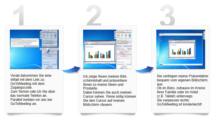 Das ist ganz einfach: Sie sitzen zu Hause, in Ihrem Büro oder im Hotel vor Ihrem Computer oder Tablet (egal ob Windows, Apple oder Android). Während ich mit Ihnen telefoniere, können Sie parallel auf Ihr Tabet oder Bildschirm schauen und den Bildschirminhalt sehen, der auch auf meinen PC in meinem Büro zu sehen ist. Fast so, als ob Sie neben mir am Tisch sitzen und auf meinen Bildschirm schauen. Sie können sogar mit dem Cursor aus der Ferne auf meinen Bildschirm gehen. Vorher bekommen Sie einen Link per eMail mit einem Zugangscode für einen geschützten Onlinezugang über GoToMeeting zugesandt. Weite und lange Anfahrtswege waren gestern, bequeme Online-Beratung ist heute. GoToMeeting ist kinderleicht!